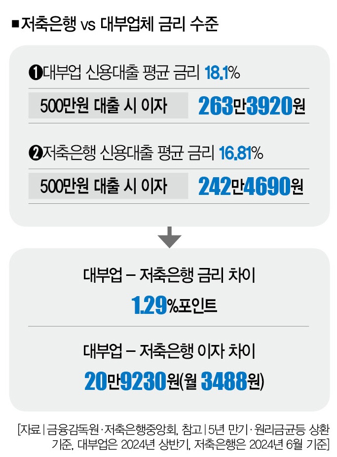 신용대출(5년 만기·원리금균등 상환)로 500만원을 빌렸다고 가정하면 저축은행에 내는 이자는 242만4690원, 대부업체의 이자는 263만3920원인 셈이다. 급전急錢이 필요한 사람들이 ‘저축은행이나 대부업체나 매한가지’란 푸념을 늘어놓는 이유가 여기에 있다.