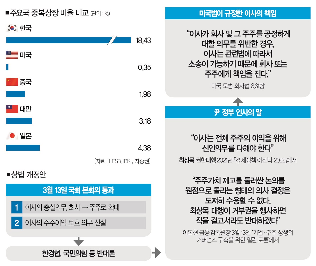 중복상장은 총수의 의결권과 재산을 불려주던 여러 편법 중 하나에 불과하다. 상법 개정안은 이런 지배주주 사익 추구에 회사 경영진을 동원하는 것을 막고, 손해배상까지 물을 수 있는 근거가 될 수 있다.