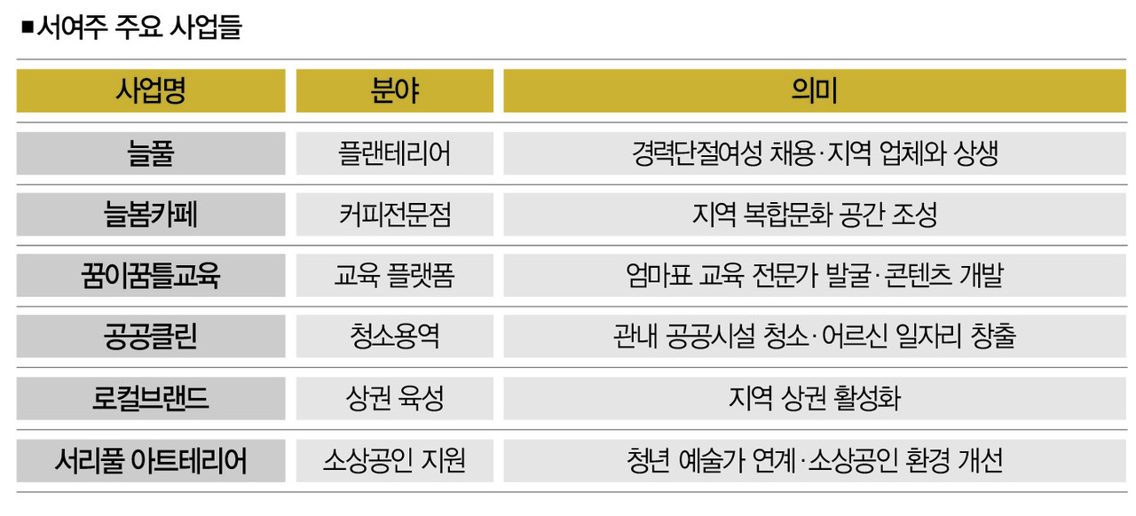 서여주의 사업은 이뿐만이 아니다. ‘꿈이꿈틀교육’도 대표 사업 중 하나다. 이른바 ‘엄마표 교육 전문가’를 발굴하고 이들을 통해 아이들의 재능을 키우는 교육 프로그램이다. 경력단절여성 중 자신만의 교육방법을 갖고 있는 이들을 찾아 이를 콘텐츠화하고 있다. 엄마와 아이가 함께 성장하는 교육 프로그램인 셈이다.