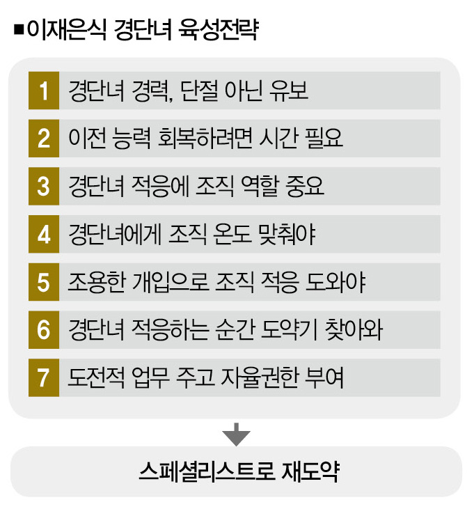 “당연합니다. 적응 후에도 조직 차원에서 ‘조용한 개입’을 계속해야 합니다. 좀 더 자세히 말해볼게요. 재취업한 경단녀가 심리적 안정을 찾으면, ‘도약기’가 옵니다. 그때 조직은 ‘조용한 개입’을 통해 도전적 업무를 하나씩 늘려주고, 자율 권한도 부여해야 합니다. 그러면 경력유보, 혹은 경력단절이란 어둡고 긴 터널에서 벗어나 ‘뛰어난 전문가’로 활동할 수 있는 길에 접어듭니다.”