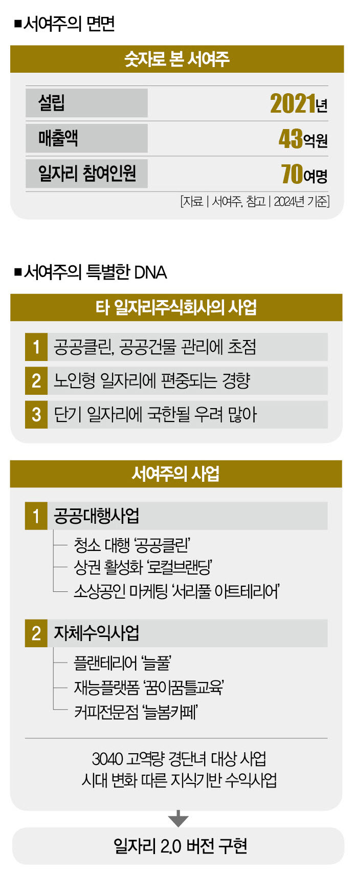 어쩌면 이 전략은 서여주를 ‘특별한 기관’으로 올려놓은 원동력일지 모른다. 공공미화(클린)나 건물관리에 초점을 맞춘 다른 ‘일자리주식회사(지자체 출자회사)’들과 사업적 방향성이 완전히 달라서다.