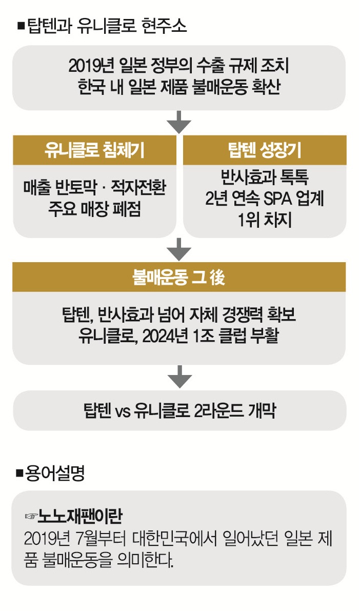 ‘노노재팬’이 들불처럼 일어난 기간, 탑텐은 국내 SPA 시장의 1위로 올라섰다. 2021년 매출액 5850억원을 기록해 유니클로(5824억원)를 처음 따돌렸고, 기세는 2022년까지 이어졌다.