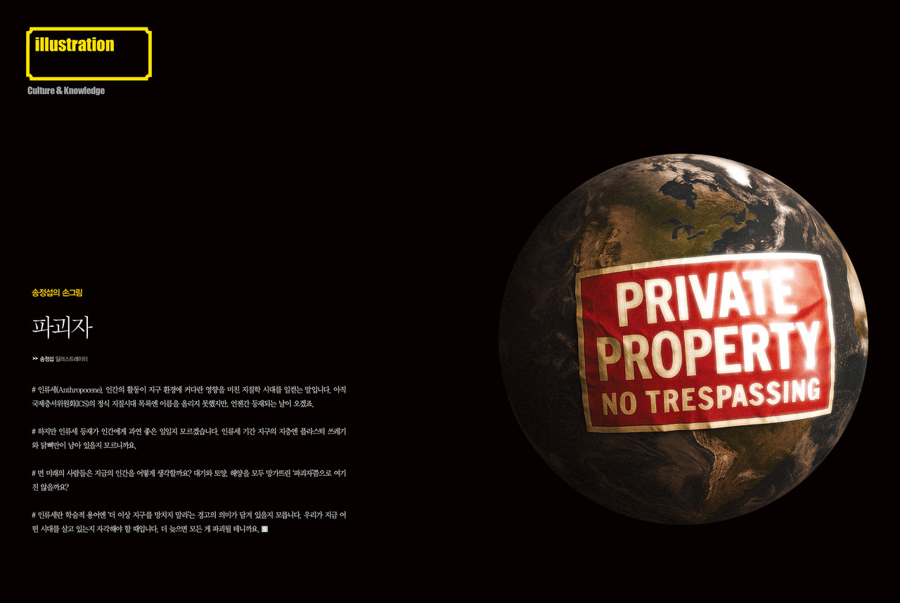 # 인류세란 학술적 용어엔 ‘더 이상 지구를 망치지 말라’는 경고의 의미가 담겨 있을지 모릅니다. 우리가 지금 어 떤 시대를 살고 있는지 자각해야 할 때입니다. 더 늦으면 모든 게 파괴될 테니까요.