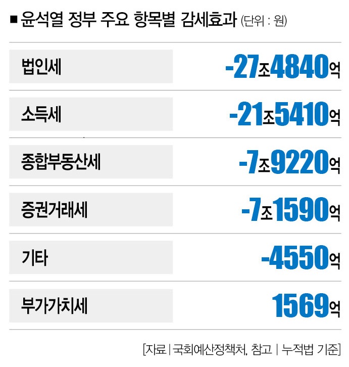 2023년과 2024년 세법개정안도 각각 2조9360억원, 18조3940억원의 세금을 줄이는 효과로 이어졌다. 이에 따르면 총 81조6380억원의 세금이 감세 정책 탓에 덜 걷힌 셈이다. 이를 항목별로 보면, 법인세 -27조4840억원, 소득세 -21조5410억원, 종합부동산세 -7조9220억원, 증권거래세 -7조1590억원 등이다.