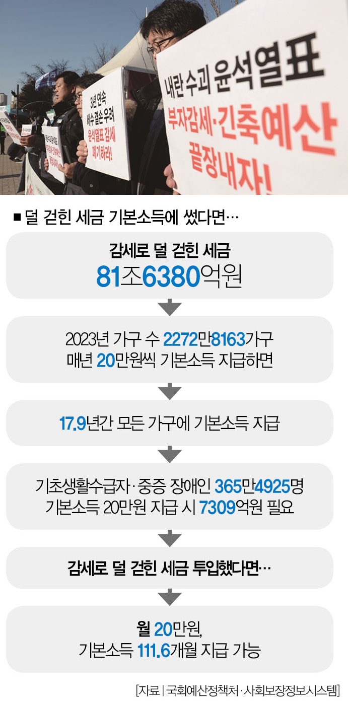 그렇다면 이를 기본소득이나 또다른 복지에 썼다면 어땠을까. 통계청의 인구총조사 결과에 따르면 2023년 우리나라 가구 수는 2272만8163가구를 기록했다. 윤 정부의 감세정책으로 덜 걷힌 81조6380억원을 기본소득 재원으로 활용했다면 매년 가구당 20만원의 기본소득을 17.9년간 지급할 수 있다.