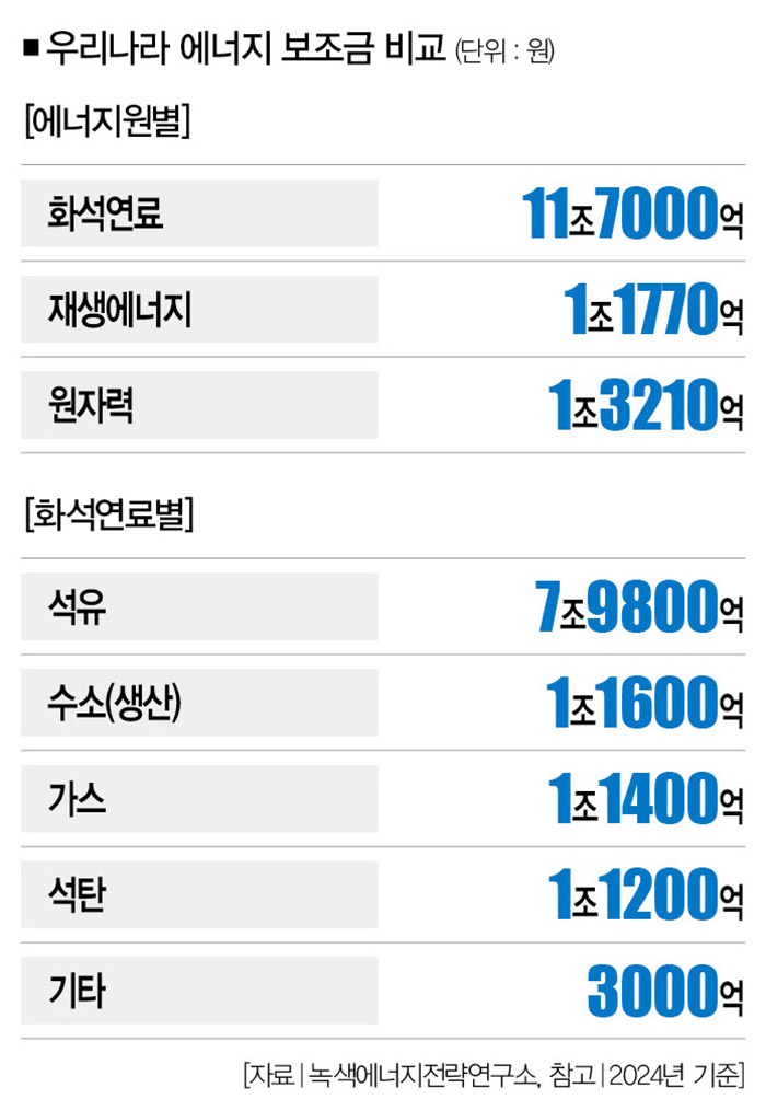 기후정책 전문 민간싱크탱크인 녹색에너지전략연구소가 2023~2024년 에너지 보조금 규모를 비교 분석해 발표한 ‘기후위기에 역행하는 국내 화석연료 보조금의 실체’ 보고서(2024년)에 따르면 지난해 기준 화석연료 보조금(세제혜택 포함)은 11조7000억원으로, 재생에너지 보조금(1조2000억원)의 9.8배에 달했다. 물론 여기엔 유류세율 인하에 따른 세제혜택 4조5000억원이 들어 있지만, 이를 빼더라도 보조금은 수조원에 이른다.