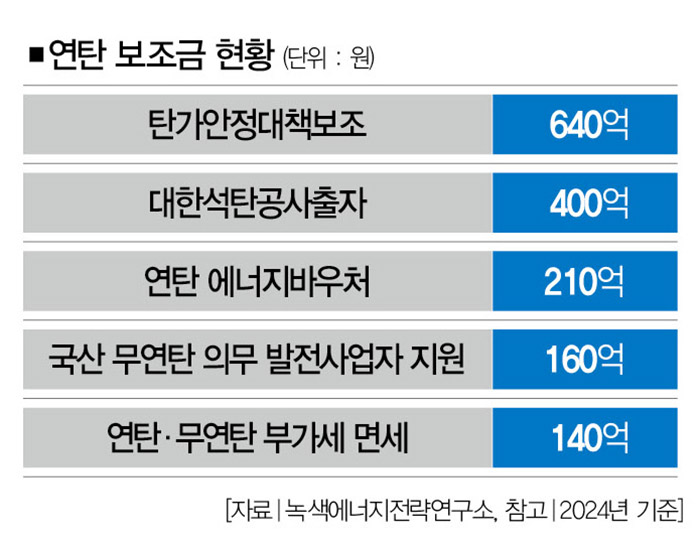 가장 이해할 수 없는 건 석탄ㆍ연탄 관련 보조금이다. 한국은 2010년 G20 정상회의에서 2020년까지 석탄ㆍ연탄 관련 보조금을 완전히 폐지하기로 약속했다. 하지만 지금도 무연탄의 생산ㆍ발전ㆍ사용에 보조금을 지급하고 있다. 2024년 기준 1560억원 규모로, 2023년(1420억원)보다도 증가했다.
