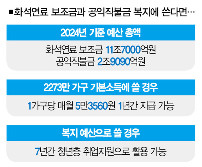 사례로 든 정책을 종합하면, 화석연료 보조금 11조7000억원과 공익직불금 예산 2조9090억원을 합친 총 14조6090억원이 낭비된 셈이다. 만약 이 돈을 농어촌 기본소득 재원으로 활용한다면 어떻게 될까. 2023년 기준 우리나라 농가와 어가 인구 217만6100명에게 매월 20만원씩 지급한다면 약 3년간 쓸 수 있는 재원이다.