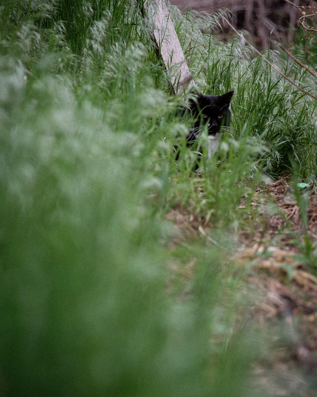 # 검은 고양이는 검정 옷에 검정 카메라를 들고 있는 저를 보고 살짝 놀란 눈치입니다. 고양이도, 저도 서로 바라본 채 잠시간 대치합니다. 자신의 여유로운 산책길을 방해한 낯선 자에게 보내는 약간의 원망과 경계, 그리고 어쩌면 약간의 호기심이 섞인 눈빛이 느껴집니다.