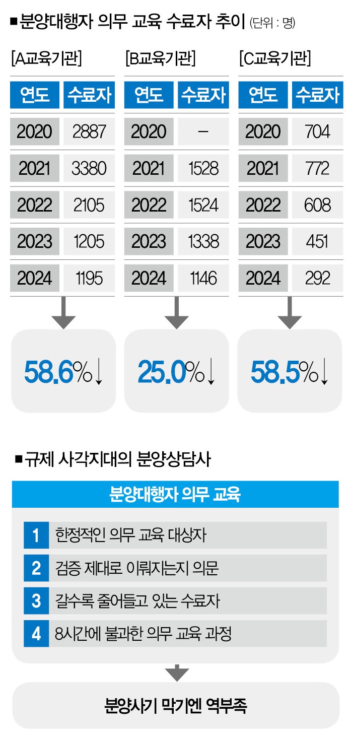 분양대행자 의무교육 기관 관계자는 “분양대행자 의무 교육에 사각지대가 있는 건 사실”이라며 “의무 교육을 받는 분양대행자가 갈수록 줄어들고 있다”고 말했다.