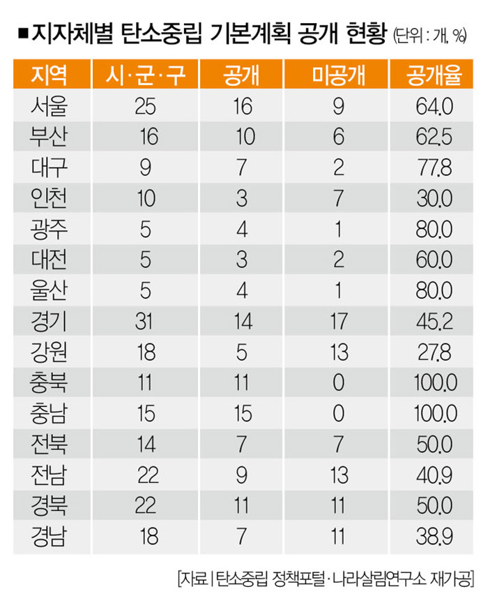 하지만 나라살림연구소가 ‘탄소중립 정책포털’에서 지자체의 탄소중립 기본계획 수립 현황을 살펴보니 기초지자체 100곳(44.2%)이 아직 제출하지 않은 것으로 드러났다.[※참고: 지자체가 탄소중립 기본계획을 수립하면 기본적으로 ‘탄소중립 정책포털’에 공개한다. 따라서 여기에 계획을 공개하지 않은 곳은 ‘미공개’로 판단했다. 이 현황은 6월 22일 전수조사한 결과다.]