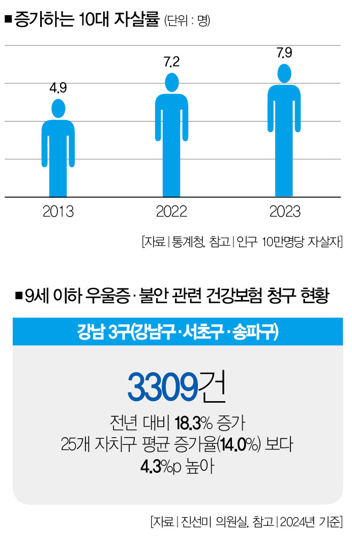 실제로 2023년 10대(10~19세) 인구 10만명당 자살자는 7.9명으로 2022년(7.2명) 대비 9.7%나 증가했다. 미래를 걱정스럽게 만드는 통계는 또 있다. 진선미 더불어민주당 의원실에 따르면 영어유치원이 밀집한 강남 3구(강남구ㆍ서초구ㆍ송파구)에서 9세 이하 영유아ㆍ아동이 우울증·불안장애로 건강보험을 청구한 건수는 지난해 3309건으로 전년(2797건) 대비 18.3% 증가했다. 서울 25개 자치구 평균 증가율(14.0%)을 4.3%포인트 웃도는 수치다.