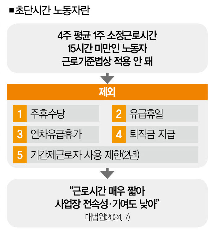 그렇다면 하루 2~3시간만 일하는 초단시간 노동자에게도 주휴수당, 유급휴일, 연차휴가, 공휴일 유급휴일 등을 보장해야 할까요? 현재는 그럴 ‘의무’가 없습니다. 초단시간 노동자는 근로기준법 적용 대상이 아니기 때문이죠. 워낙 짧은 시간 근무하는 만큼 사업장 전속성이나 기여도가 낮다고 봤던 겁니다.