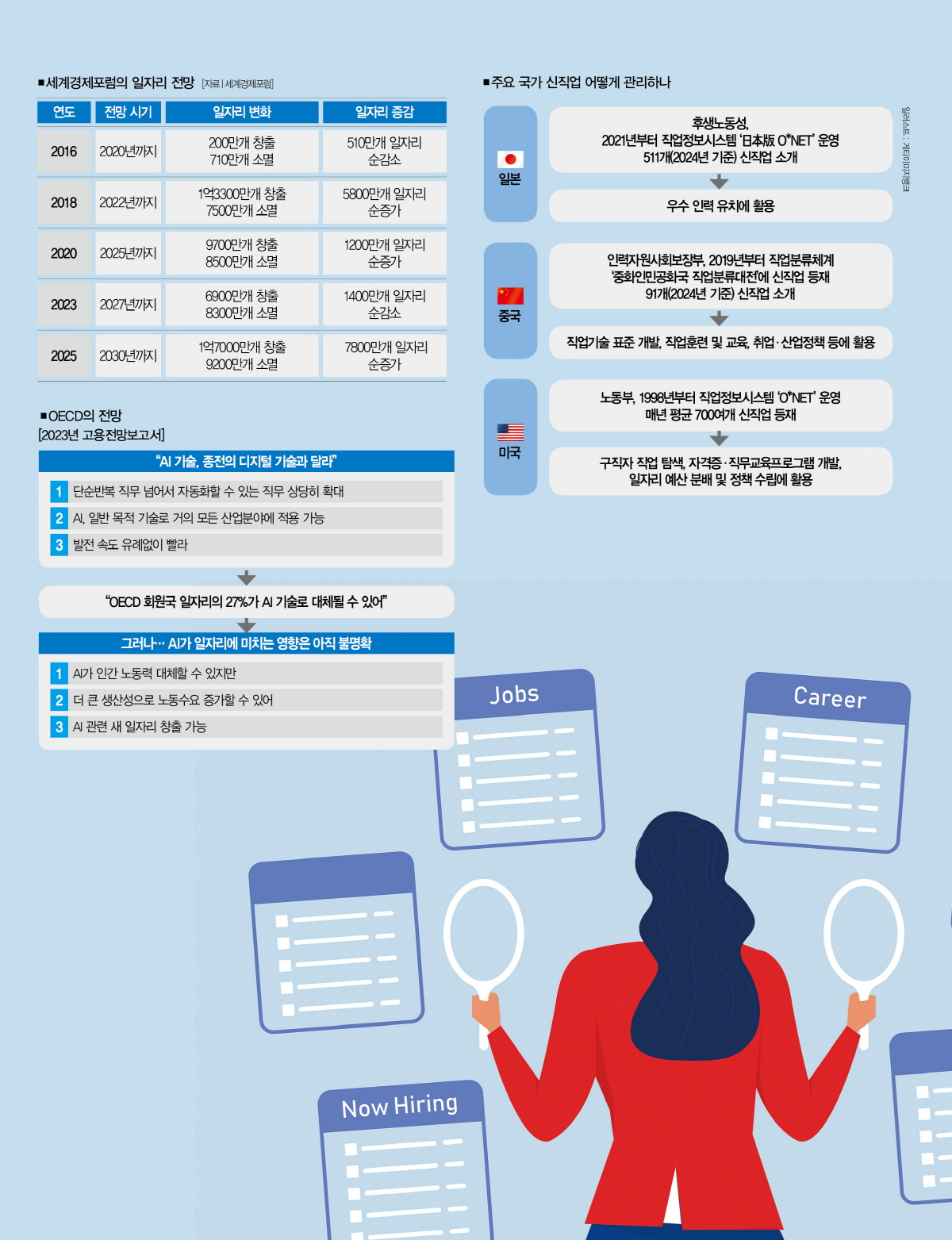 중국 역시 2019년부터 인력자원사회보장부가 운영하는 ‘중화인민공화국 직업분류대전’에 신직업을 등재하고 있고, 올해까지 91개의 새로운 직업의 이름을 올렸다. 일본의 후생노동성은 2021년부터 2024년까지 직업정보시스템 ‘日本版 O*NET’에 신직업 511개를 소개했다.