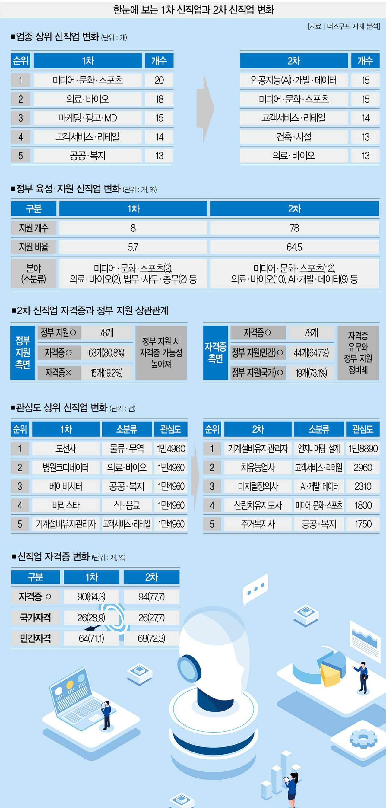 2차 신직업은 달랐다. 대분류로는 정보통신ㆍ과학(20개), 건축ㆍ환경ㆍ안전(19개), 경영ㆍ사무ㆍ금융(17개), 문화ㆍ예술ㆍ미디어(16개), 농림어업(13개), 의료ㆍ보건(13개) 분야가 많았다. 소분류로는 인공지능(AI)ㆍ개발ㆍ데이터(15개), 미디어ㆍ문화ㆍ스포츠(15개), 고객서비스ㆍ리테일(14개), 건축ㆍ시설(13개), 의료ㆍ바이오(13개) 분야 순이었다.