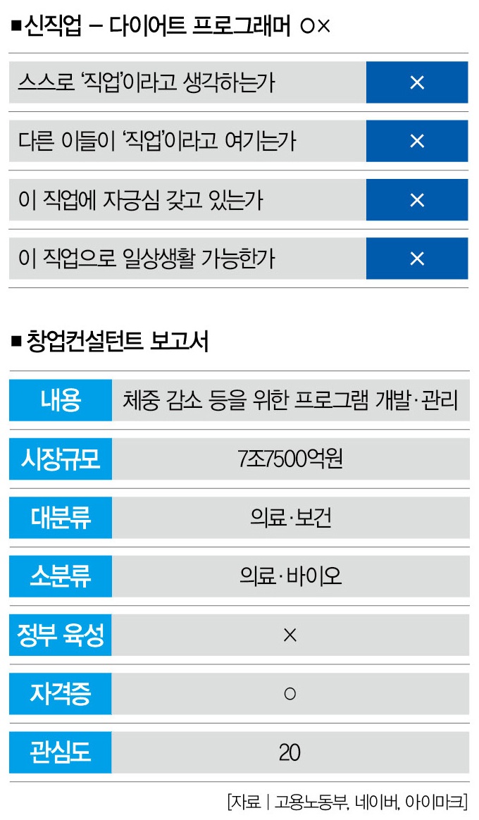 정부는 2011년에 다이어트 프로그래머를 ‘신직업’에 등재했다. 하지만 신직업이 활동할 만한 ‘시장’을 만드는 덴 실패했다. 국내 포털사이트 네이버를 통해 확인한 관심도(20점)도 높지 않다(7월 14일~8월 14일 통계). 만약 다이어트 프로그래머를 ‘국가자격증’으로 전환했다면 어떻게 됐을까. 박 교수가 내린 비관적 진단과는 다른 모습을 보이지 않았을까.
