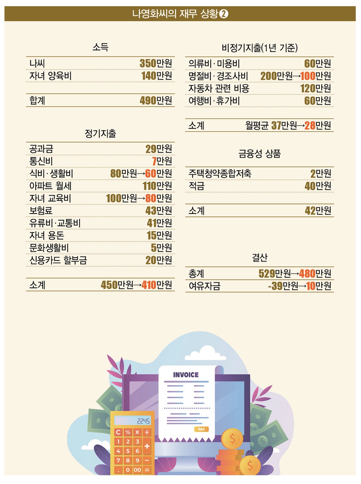 1편에서 살펴본 영화씨의 가계부 상태는 이렇다. 월 소득은 490만원이다. 중소기업에 다니는 영화씨가 350만원을 벌고, 전남편으로부터 자녀 양육비로 140만원을 받는다. 지출은 정기지출 457만원, 1년에 걸쳐 쓰는 비정기지출 월평균 37만원, 금융성 상품 42만원 등 536만원이다.