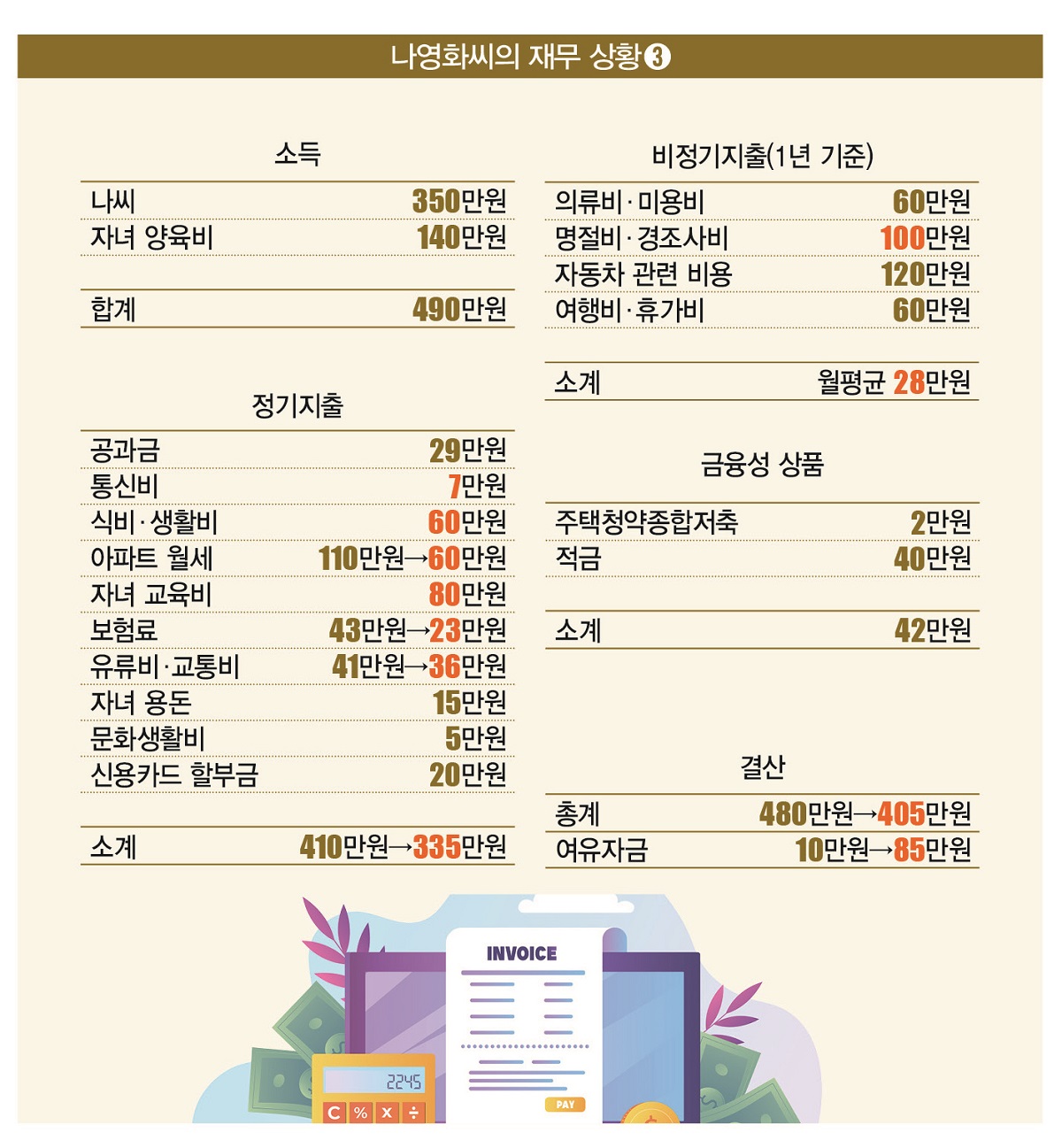 지출은 정기지출 457만원, 1년에 걸쳐 쓰는 비정기지출 월평균 37만원, 금융성 상품 42만원 등 536만원이다. 월 적자 규모는 46만원인데, 영화씨는 지출을 줄여 10만원 흑자로 전환시켰다. 자산은 월세 아파트 보증금 3000만원과 주식 2000만원, 현금 2000만원 등 7000만원이다.