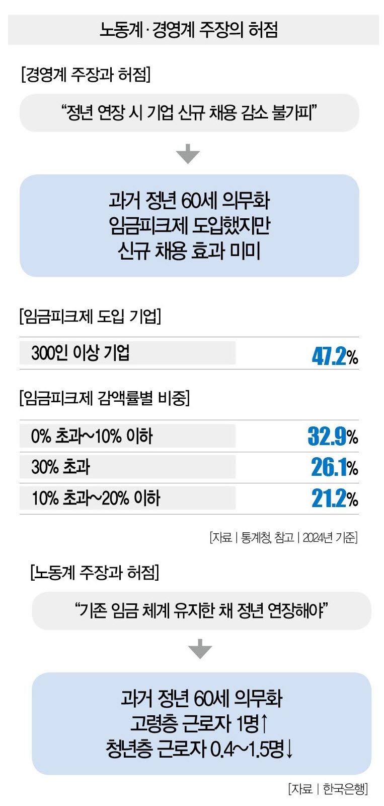 정부도 대안을 마련하긴 했다. 정년을 연장하되 일정 연령부터 임금을 감액하는 ‘임금피크제’가 정부의 솔루션이었다. 기업의 인건비 부담을 덜어주고, 그 여력으로 청년들을 신규 고용하자는 취지였다. 공공기관과 일부 대기업을 중심으로 2016년 도입한 임금피크제는 2024년 기준 전체 사업장의 16.7%, 300인 이상 사업장의 47.2%가 운영 중이다.