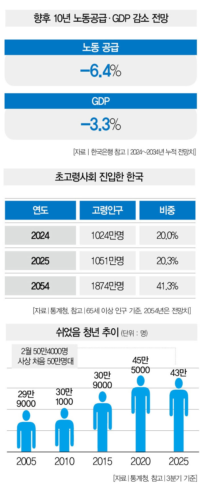 실제로 한국은행은 지난 4월 발표한 ‘초고령사회와 고령층 계속근로 방안’ 리포트에서 “인구 변화로 향후 10년간(2024~2034년 누적 기준) 노동공급량은 6.4% 감소하고, 그에 따른 경제성장률(GDP)은 3.3% 줄어들 것”이라고 분석했다.