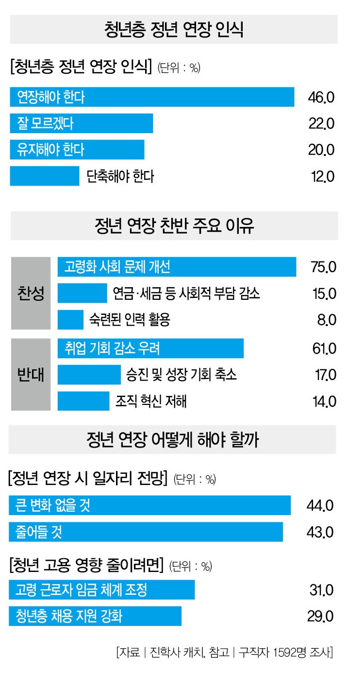 이 때문인지 중장년층뿐만 아니라 청년층도 정년 연장의 필요성에 공감하고 있다. 채용 플랫폼 진학사 캐치가 지난 2월 구직자 1592명을 대상으로 실시한 정년 연장 관련 설문조사 결과, “정년을 연장해야 한다”는 응답자는 46.0%에 달했다.