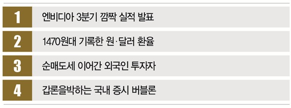 AI 인프라에 투자한 기업의 수익성이 기대에 미치지 못하면서 엔비디아 실적에도 부정적인 영향을 줄 것이란 우려가 커졌다. 여기에 미 연방준비제도(연준·Fed)의 12월 금리 인하 가능성이 불투명해진 것도 증시 하락을 부추겼다.