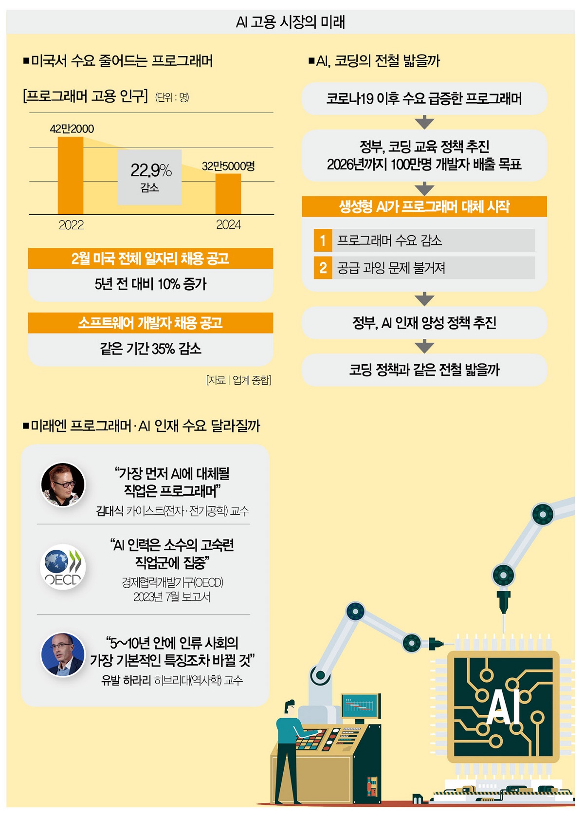 # 문제는 이 흐름이 낯설지 않다는 겁니다. 불과 몇년 전만 해도 정부는 ‘코딩 인재를 양성해야 한다’며 교육 시스템을 대대적으로 손봤습니다. 하지만 그때 배운 학생들이 오늘날 설 자리는 충분하지 않습니다. 코딩을 대신 해주는 ‘생성형 AI’가 등장하면서 프로그래머 수요가 급격히 줄고 있는 탓입니다.