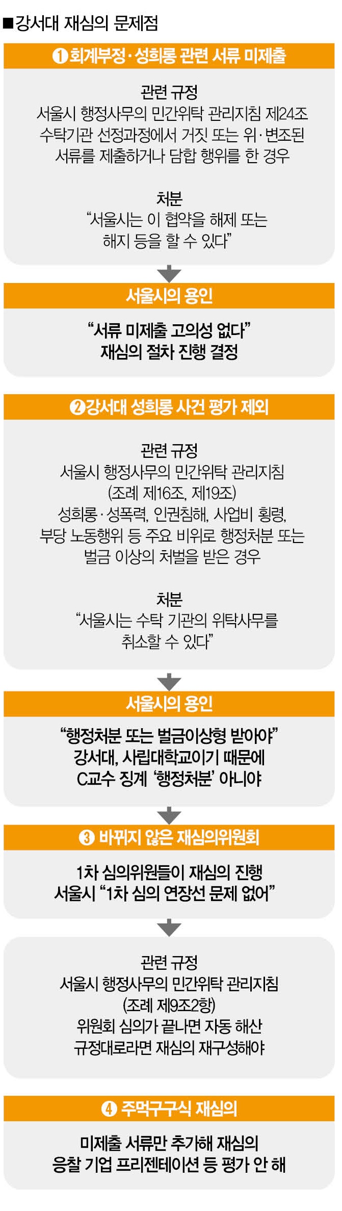 더 큰 문제는 여기서부터다. 서울시는 강서대의 ‘성희롱 사건’을 감점 요인에서 아예 제외했다. 강서대가 위탁경영했던 곳에서 벌어진 ‘성희롱 사건’을 평가하지 않았다는 거다. 서울시는 무엇을 근거로 이런 결정을 했을까. 이 이야기는 독자의 이해를 돕기 위해 1문 1답 방식으로 풀어서 설명했다.