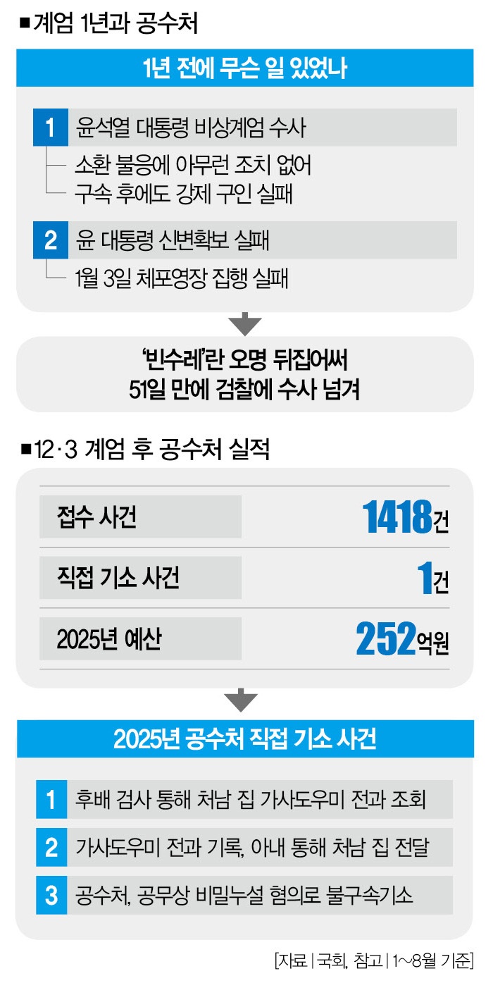 ■ 계엄과 헛발질 = 검찰개혁의 상징에서 아픈 손가락으로 전락했던 공수처가 다시 스포트라이트를 받은 건 지난해 12월 3일 오후 10시 윤석열 대통령(이하 당시 직책)이 비상계엄을 선포하면서다.