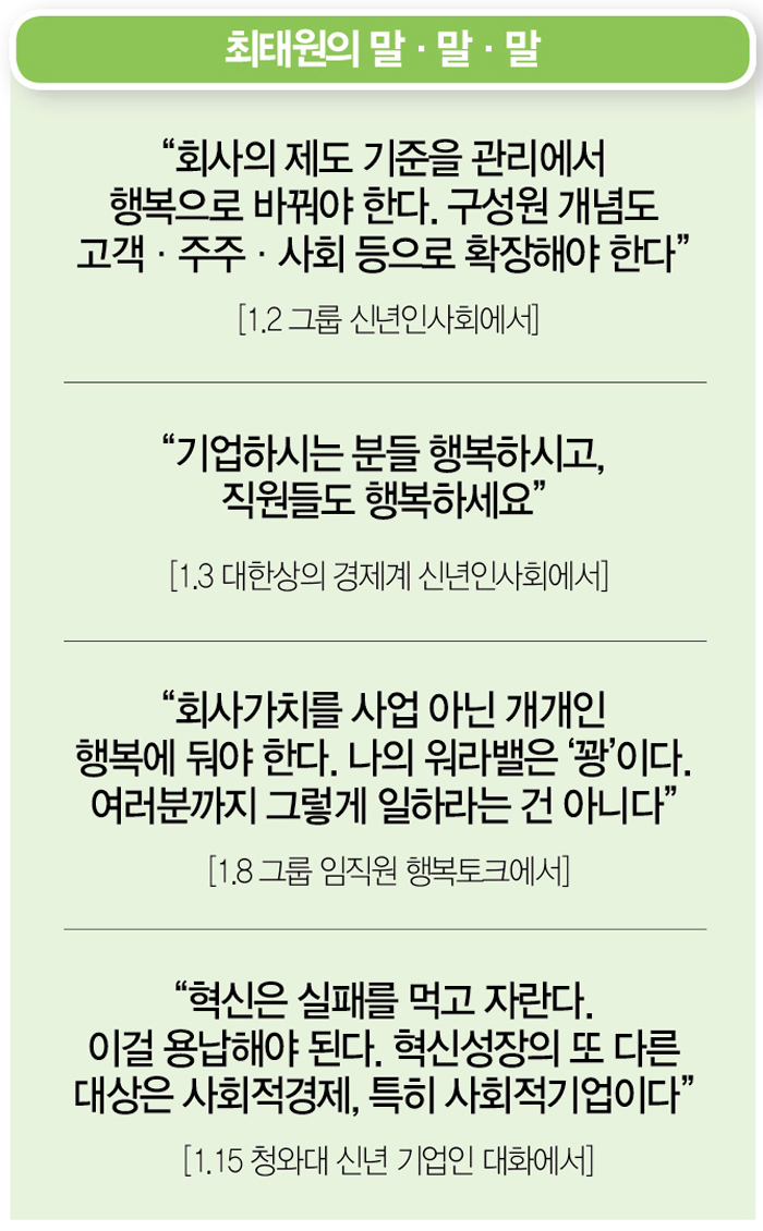 눈길 끌었던 발언들은 다음과 같다. “회사의 제도 기준을 관리에서 행복으로 바꾸자” “구성원의 개념을 고객ㆍ주주ㆍ사회 등으로 확장해야 하며, 협력업체도 SK가 아니라고 할 수 없다” “KPI(핵심성과지표)에서 SV(사회적 가치) 평가 비중을 50%까지 늘리자” “더 행복하기 위해 인사하기ㆍ칭찬하기ㆍ격려하기 등 작은 실천을 더해 나가자” 등이다.