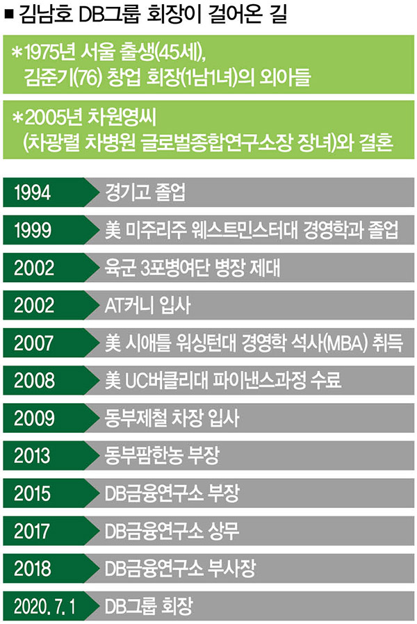 사실 김남호 회장을 보는 재계의 시선은 다소 엇갈린다. 한편에선 “젊고 촉망받는, 잘 준비된 회장”이라 하고, 다른 편에선 “승계 수업 기간 내내 별 특징이 안 보여 리더십에 의문이 있다”고 한다. 그는 공부와 군 복무를 마치고 2009년 34세 때 동부제철 차장으로 입사한 후 11년(2009~2020년) 동안 승계 수업을 받았다. 동부제철 차장으로 4년, 동부팜한농 부장으로 2년, DB금융연구소 부장ㆍ상무ㆍ부사장으로 5년을 보냈다. 1남 1녀를 둔 김 전 회장의 외아들로 그의 경영 승계는 시간문제였다.