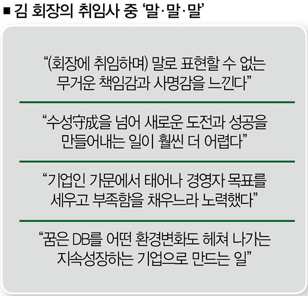 취임사를 통해 그는 많은 각오를 내비쳤다. “새로운 도전과 성공을 만드는 일이 ‘수성守成’ 못지않게 어렵다” “DB를 어떤 환경에서도 지속성장하는 기업으로 만들겠다” “기존 사업 경쟁력을 키우면서 미래 성장 발판도 하나씩 만들어 나가겠다”는 등의 말에선 비장감마저 느껴진다. 그는 “기업인 가문에서 태어나 경영자가 되겠다는 목표를 세우고 부족함을 채우기 위해 노력해 왔다”고 소개했다.