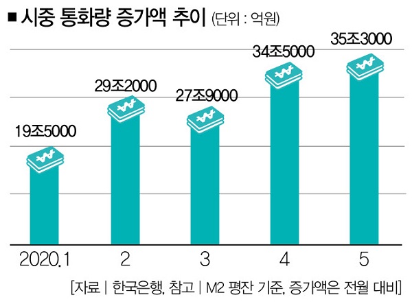 집값도 최소한 돈의 가치가 하락하는 만큼은 상승하기 마련이다. 가령 2019년 기준 통화량 증가율(연 7.5%)로 보면, 집값은 다른 변수가 없다면 연 7.5%는 오른다고 보면 된다. 문제는 이 돈의 가치가 급속하게 떨어지고 있다는 점이다. 시중 통화량을 나타내는 광의통화(M2)는 올해 5월 사상 처음으로 3000조원을 돌파한 3053조원으로 전월 대비 35조원이나 늘었다.