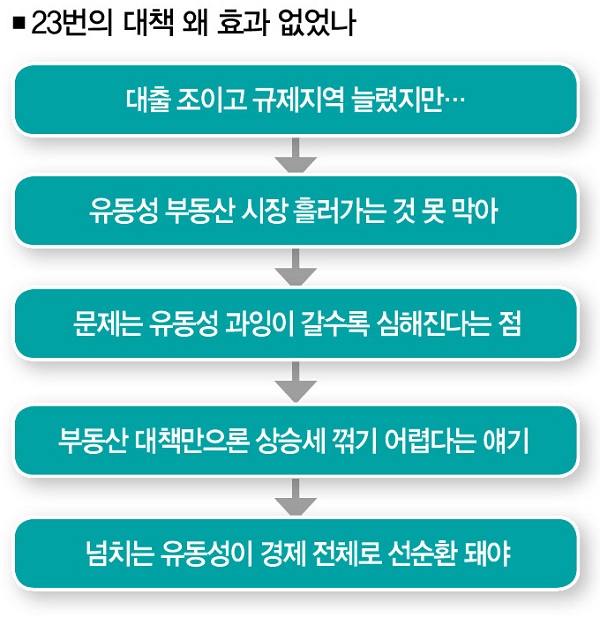 부동산을 둘러싼 국민들의 원성이 높다. 23번의 대책을 내놓고도 시장 안정화에 실패한 건 정부의 무능과 정책 실패라는 지적이다. 하지만 시중에 풀린 막대한 돈을 생각하면 집값 상승은 불가피한 일이었다. 문제는 이 상승세의 기울기가 점점 가팔라지고 있다는 점이다. 부동산 시장만을 타깃으로 한 좁은 관점의 대책으론 이를 완만하게 꺾는 게 불가능하다.