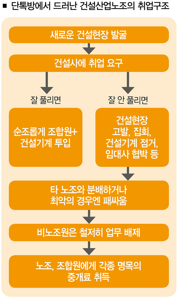 후자의 경우 비노조원을 몰아내고 현장 일감을 빼앗는다. 때로는 협박도 한다. 순순히 물러나지 않으면 비노조원들이 다른 현장에서도 일하지 못하도록 방해공작을 펴기도 한다. 그래서 어느 쪽이든 노조에 가입하는 이들이 많다. 건설사가 비협조적으로 나올 때도 마찬가지다. 고발과 집회, 협박 등이 병행된다. 과정은 일사불란하고, 조직적이다. 단톡방에선 언제, 어느 현장에서, 어느 건설사의 누구를 만났고, 어떤 협의를 했는지도 공유된다.