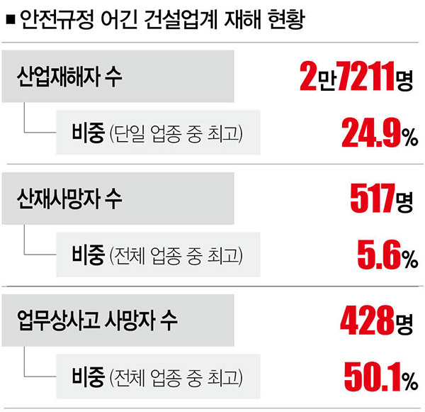 이쯤 되면 한가지 의문이 든다. 왜 건설사는 이런 노조의 불법행위에 당하고만 있느냐는 거다. 답은 간단하다. 안전규정을 제대로 지키는 건설사가 단 1곳도 없기 때문이다. 건설사들이 어기는 안전규정 종류는 다양했다. 비산먼지 방출, 폐기물 관리부실, 신호수 미배치, 안전난간 미설치, 비계 고소작업 시 안전고리 미체결, 로프 미사용, 낙하물 방지망 미설치, 불법 가설물 설치 등이다.