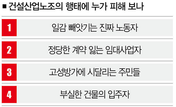 일감을 빼앗기 위해 큰소리로 집회를 하고 싸움을 벌이니 지역 주민들도 피해자다. 뒷돈들이 오가는 건설현장에서 건물이 제대로 지어질 리 없으니 입주자들이 피해자다. 건설사와 노조, 과연 이대로 둬도 될까.