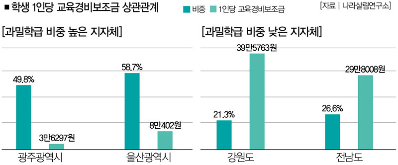 실제로 OECD 대비 과밀학급 비중이 적은 강원도(21.3%)와 전남도(26.6%)의 경우, 학생 1인당 교육경비보조금은 각각 39만5763원과 29만8008원이었다. 반면 과밀학급 비중이 높은 광주(49.8%)나 울산(58.7%)의 1인당 교육경비보조금은 3만6297원과 8만402원이었다.