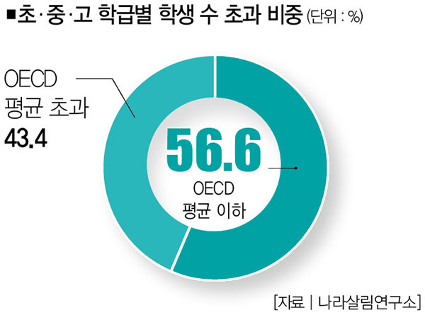 문제는 학급당 평균 학생이 경제협력개발기구(OECD) 가입국의 평균(23명)보다 많은 ‘과밀학교’가 전체 초ㆍ중ㆍ고의 43.4%에 달한다는 점이다. 지역별로 보면, 경기도는 69.9%, 울산은 58.7%가 과밀학교였다. 특히 경기도는 전체 학교의 9.2%가 한 반에 30명 이상의 ‘과밀학교’인 반면, 강원도나 세종시는 30명 이상인 곳이 단 한곳도 없었다. 경북도와 전남도는 1%도 채 되지 않았다.