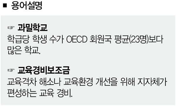 더 큰 문제는 학급당 학생이 많으면 학생 1인당 교육경비보조금도 줄어든다는 거다. 교육경비보조금은 교육격차를 해소하거나 교육환경을 개선하기 위해 광역ㆍ기초자치단체가 교육청 예산과 별도로 지출하는 경비다. 그런데 학생이 많을수록 1인당 교육경비보조금이 줄어들어 교육격차가 더 벌어지는 역효과가 발생한다는 거다.