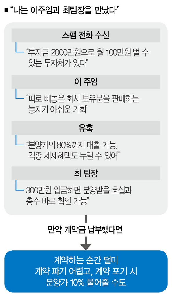 최 팀장의 인상이 약간 일그러지자 이번엔 이 주임이 나섰다. 그는 인심을 쓰는 듯 “200만원만 입금해도 분양받을 호실을 알려주겠다”며 꼬드겼다. 기자가 “이런 투자를 혼자 결정할 수 없으니 가족과 상의해 보겠다”면서 발을 빼려 하자, 처음엔 300만원에서 200만원으로 떨어졌던 금액이 100만원, 다시 50만원으로 내려갔다. 그들이 제시한 금액이 날개 꺾인 듯 곤두박질치자 최 팀장이 다시 등판했다. 감추려 했지만 그의 말투엔 ‘조급함’과 ‘답답함’이 섞여 있었다.