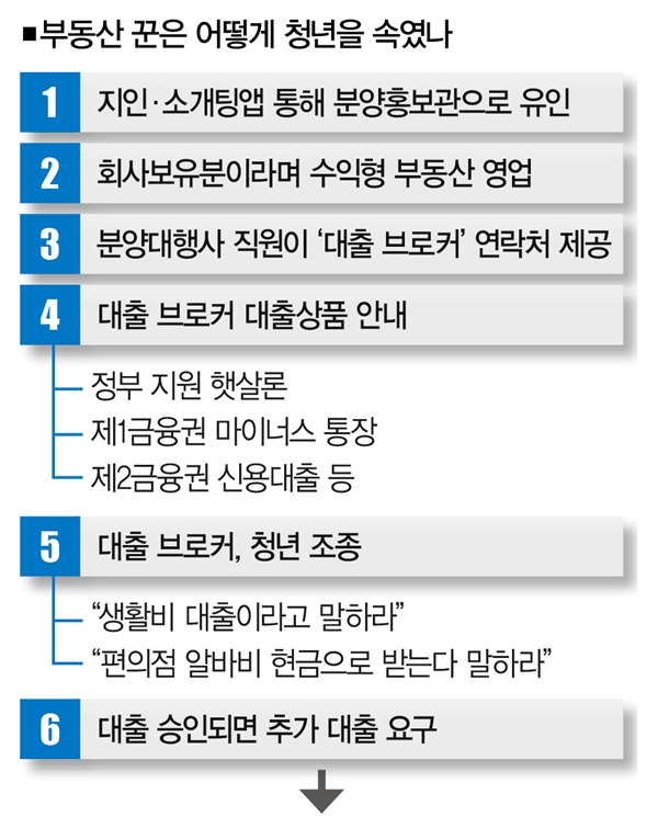 이렇게 대출 브로커와 엮인 이는 A씨만이 아니었다. 다른 청년들도 비슷한 경로로 분양홍보관을 찾았다가 ‘불편한 사슬’에 엮였다. 대출 브로커는 능수능란하게 청년들을 요리했다.