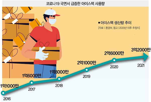 이커머스의 성장세가 눈부시다. 코로나19 국면에서 비대면 거래가 폭발적으로 늘어났기 때문이다. 시장에서 ‘장’을 보는 게 힘들어지면서 신선식품 주문량도 크게 증가했다. 그래서인지 매일 아침 현관 앞에 쌓여 있는 택배 상자가 이젠 흔한 풍경이 됐다. 문제는 배달량이 늘면서 ‘아이스팩’도 함께 증가했다는 거다.