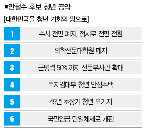 “10년 전 청춘콘서트를 통해 청년들과 많은 공감을 했다. 하지만 대학교수가 할 수 있는 역할은 거기까지였다. 청년 문제를 직접 해결하기 위해 정치에 뛰어들었다.” 세번째 대권 도전에 나선 안철수 국민의당 대선후보는 청년공약 1~5호를 내리 내놓고, 청년들이 직접 청년 공약을 검증하고 제안하는 ‘청년내각’을 출범했다. 예나 지금이나 그를 가장 지지하는 세대는 청년이다. 안 후보는 청년들의 질문에 어떤 답을 내놨을까.