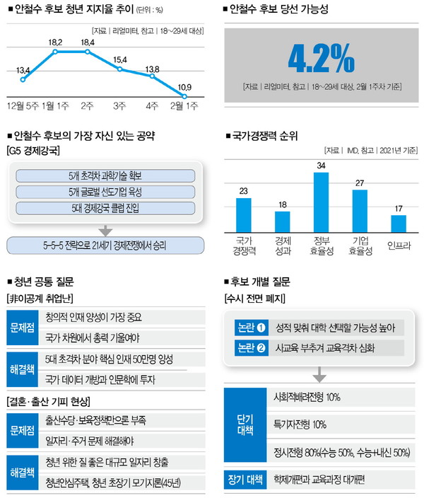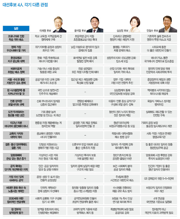 “4차산업혁명에선 창의적인 인재 양성이 중요합니다. 능력 있는 미래산업의 인재를 양성하고 확보하는 데 국가가 총력을 기울여야 합니다. 저는 5대 초격차 분야(디스플레이·2차전지·차세대 원전·수소 에너지·바이오 산업)의 핵심 인재 50만명을 양성할 계획을 짜고 이를 실현하겠다고 약속했습니다. 그렇다고 인문학과 사회과학을 후순위로 밀어놓겠다는 건 아닙니다. 인문학과 사회과학에 대한 투자도 필수입니다. 4차 산업혁명 시대엔 인간을 먼저 이해해야 사람의 마음을 얻을 수 있습니다.”