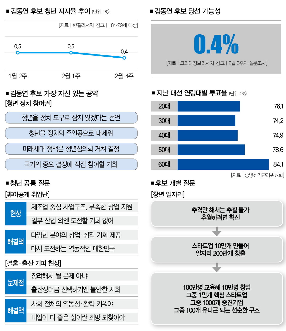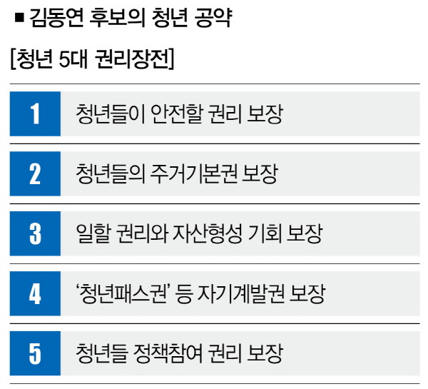 “도전하기 두려운 사회를 만들어 놓은 기성세대의 한 사람으로서 안타까움과 함께 깊은 자책을 느낍니다. 차마 용기 내 도전할 수 없는 세상을 만들어 놓고 ‘도전하라’고 등 떠밀 수는 없습니다. 그렇지만 지금까지 우리가 이룬 성장의 많은 부분이 ‘그럼에도 도전을 선택한’ 분들의 노력에서 비롯된 것도 엄연한 사실입니다. ‘도전이 두렵지 않은 나라’를 만들겠습니다. 그런 나라를 만들기 위해 청년세대가 목소리를 더 내달라고 부탁드립니다. 국가의 중요한 결정, 특히 미래세대에게 영향을 주는 환경·기후·연금문제 등에는 청년의 목소리와 의견을 적극 반영하도록 제도적인 장치를 마련하겠습니다. 아울러 청년의 도전이 자연스럽고, 실패해도 다시 도전하는 게 부끄럽지 않도록 뒷받침하는 정책을 펴겠습니다.”