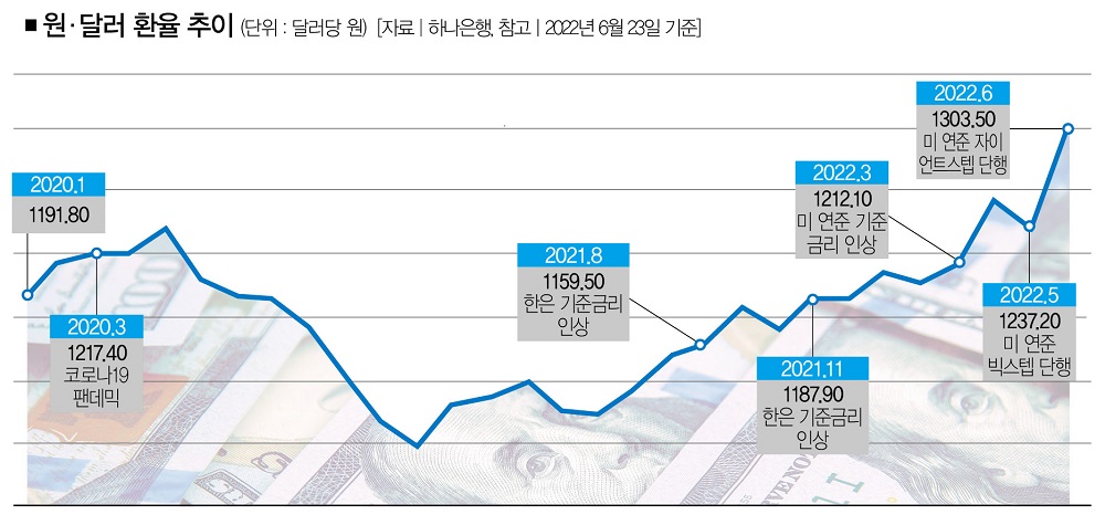 수입물가는 더 치솟을 가능성이 높다. 지난 4월 1250원대를 기록했던 원·달러 환율이 최근 1300원대를 위협하고 있어서다. 실제로 6월 23일엔 원·달러 환율이 1303.50원까지 치솟았다.