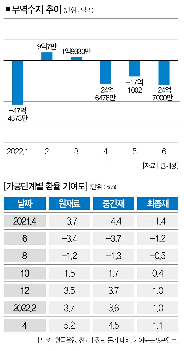 이를 잘 보여주는 사례가 있다. 무역수지 적자 행진이다. 관세청에 따르면, 5월 수출과 수입은 각각 615억950만 달러, 632만1953만 달러를 기록해 17억1003만 달러의 무역적자를 기록했다. 수출이 전년 동기 대비 21.3% 늘어날 때 수입은 32.0% 증가한 탓이다. 환율 상승세의 영향으로 수입액이 수출액을 앞지르면서 무역적자가 발생했다.