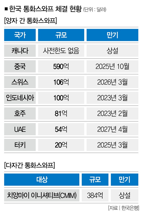 이 때문에 위기 상황에 대비해 우리나라의 통화를 상대국에 맡기고 외화를 빌려오는 통화스와프를 서둘러 확대해야 한다는 주장도 나온다. 지난해 12월 만료된 미국과 상설 통화스와프를 체결할 필요가 있다는 것이다. 문제는 미국이 이를 받아들이느냐다. 미국과 상설 통화스와프를 맺은 나라는 유럽연합(EU)·일본·영국·스위스·캐나다 등 5개 기축통화국밖에 없다.