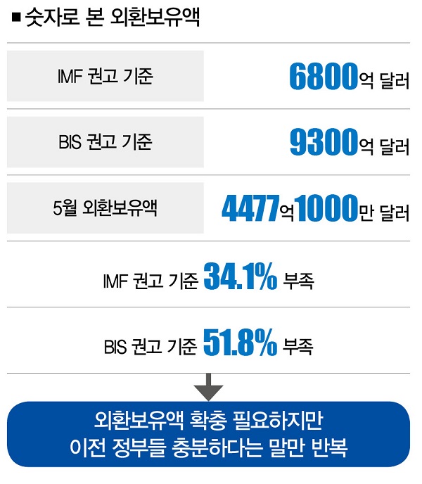 하지만 이전 정부들은 “우리나라 외환보유고는 충분하다”는 말만 반복했다. 지난해 우리나라의 외환보유액이 국제결제은행(BIS)이 제시한 적정 외환보유액(9300억 달러)의 절반 수준인 4400억 달러에 불과하다는 지적이 나왔을 때도 아랑곳하지 않았다.